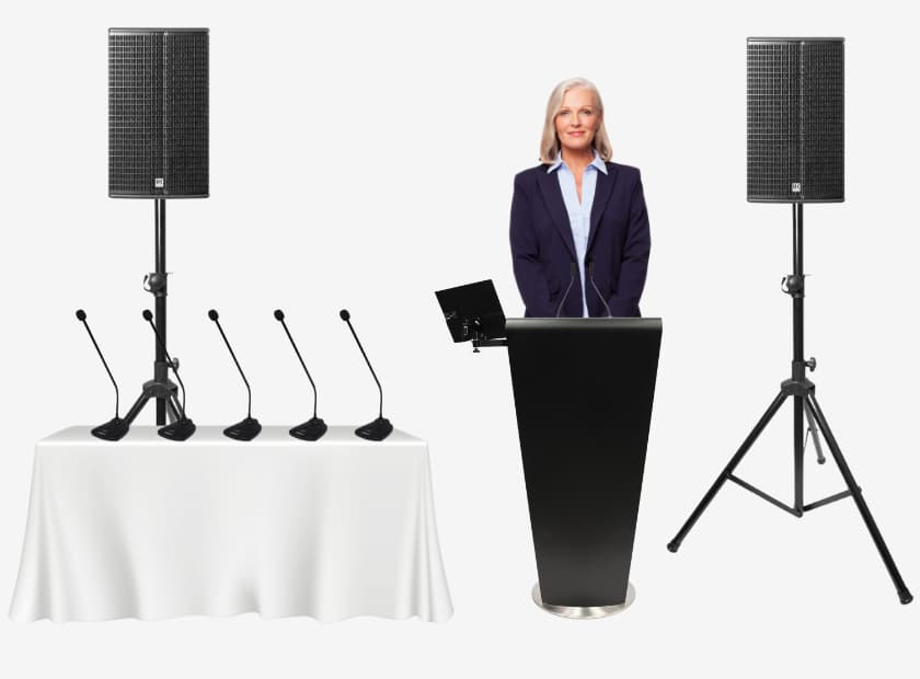 Add a touch of clarity and liveliness to your event with this package that provides all the essentials, for quality – lectern microphones, powered speakers, mixing desk, table microphones, smart lectern for premium audio performance, in any environment.